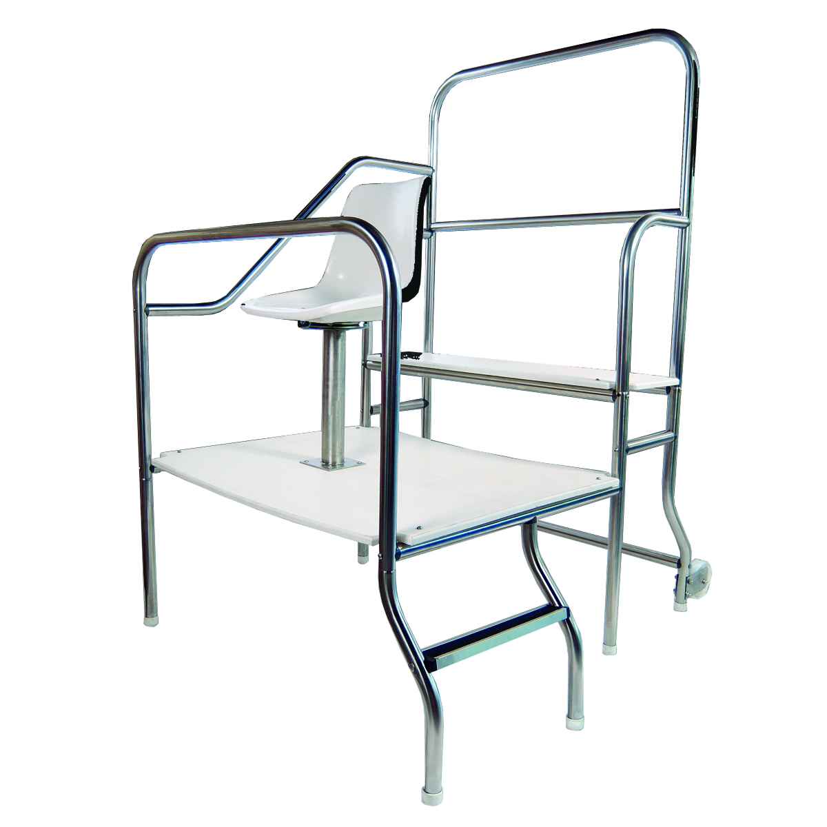 This chair is manufactured from 1.90 gauge stainless steel. It features a platform which facilitates lifeguard position changes while allowing eye contact with the patrons at all times.