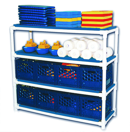 Our shelving unit has 4 shelves and can accommodate sixteen Stacking Storage Crates(ST8916). Swim equipment and boxes are not included. Assembly required.