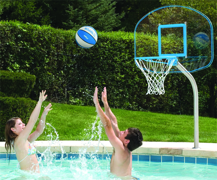 Regulation Pool Basketball Set, includes our tough 32” x 43” acrylic backboard, heavy duty 18” regulation vinyl coated stainless rim, regulation size color matched ball and notched 2 3/8” stainless post with escutcheon ring. Special brass anchor comes with finish cap to replace post when not in use. All hardware is stainless steel.